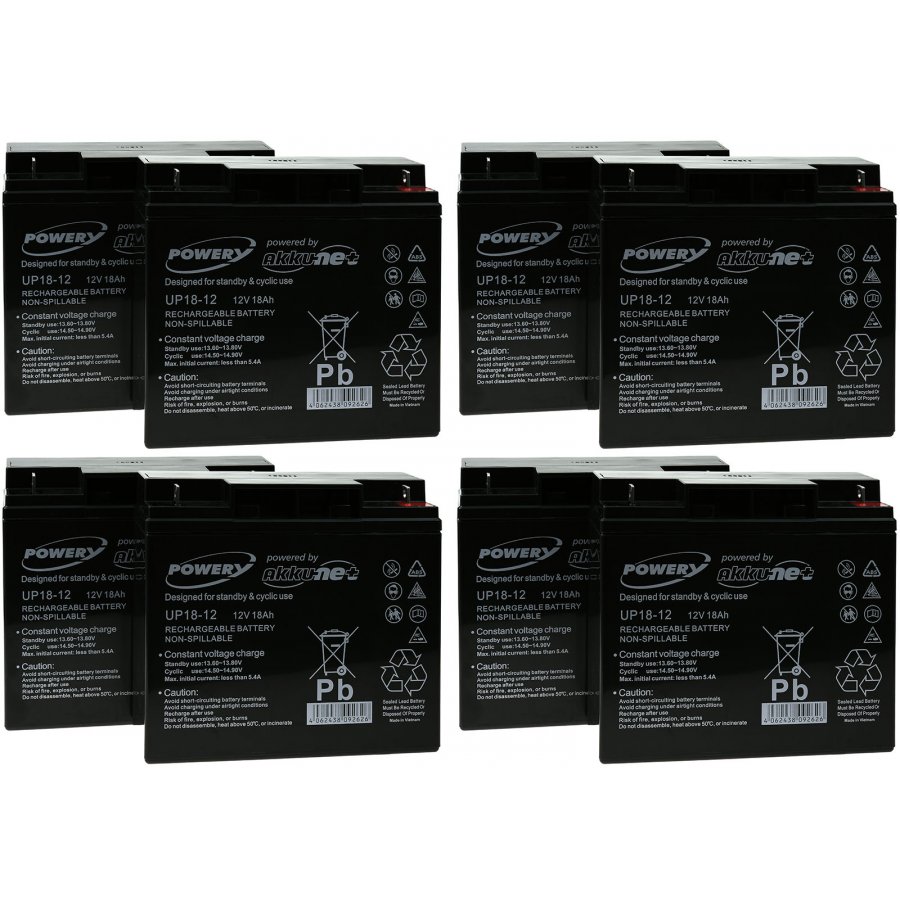 12V18Ah/216WhLead-AcidSvart181mm x 76mm x 167mmPowery4051363599119Set bestående av 8 Blybatterier! Batteriet kan beställas enkelvis.