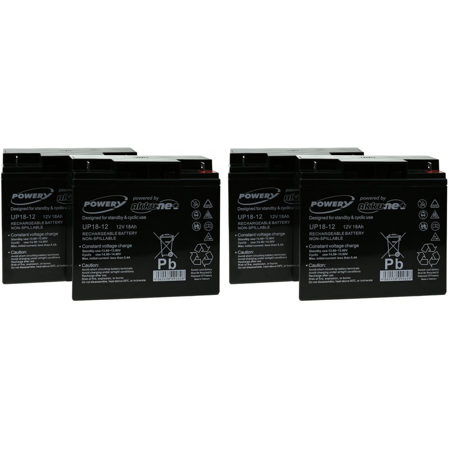 12V18Ah/216WhLead-AcidSvart181mm x 76mm x 167mmPowery4051363599157Set bestående av 4 Blybatterier! Batteriet kan beställas enkelvis.