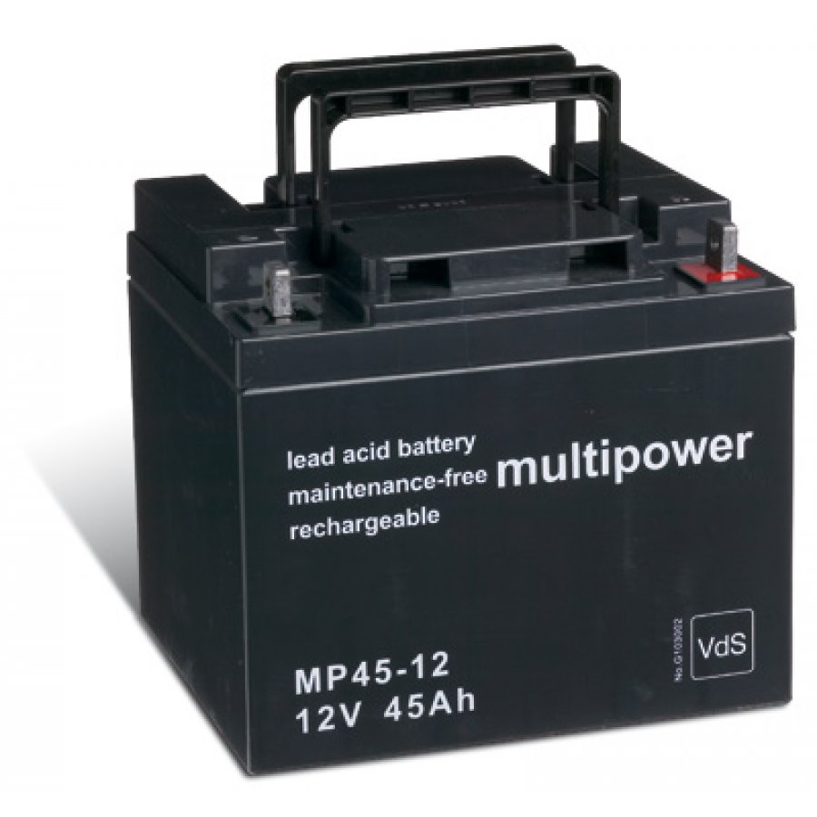 12V45Ah/540WhLead-AcidSvart198mm x 166mm x 171mmMultipower4062438099700Underhållsfria märkesbatterier av hög kvalité till strömförsörjningen industrin, till nödströmssystem (UPS-system) samt i säkerhet och larmsystem.