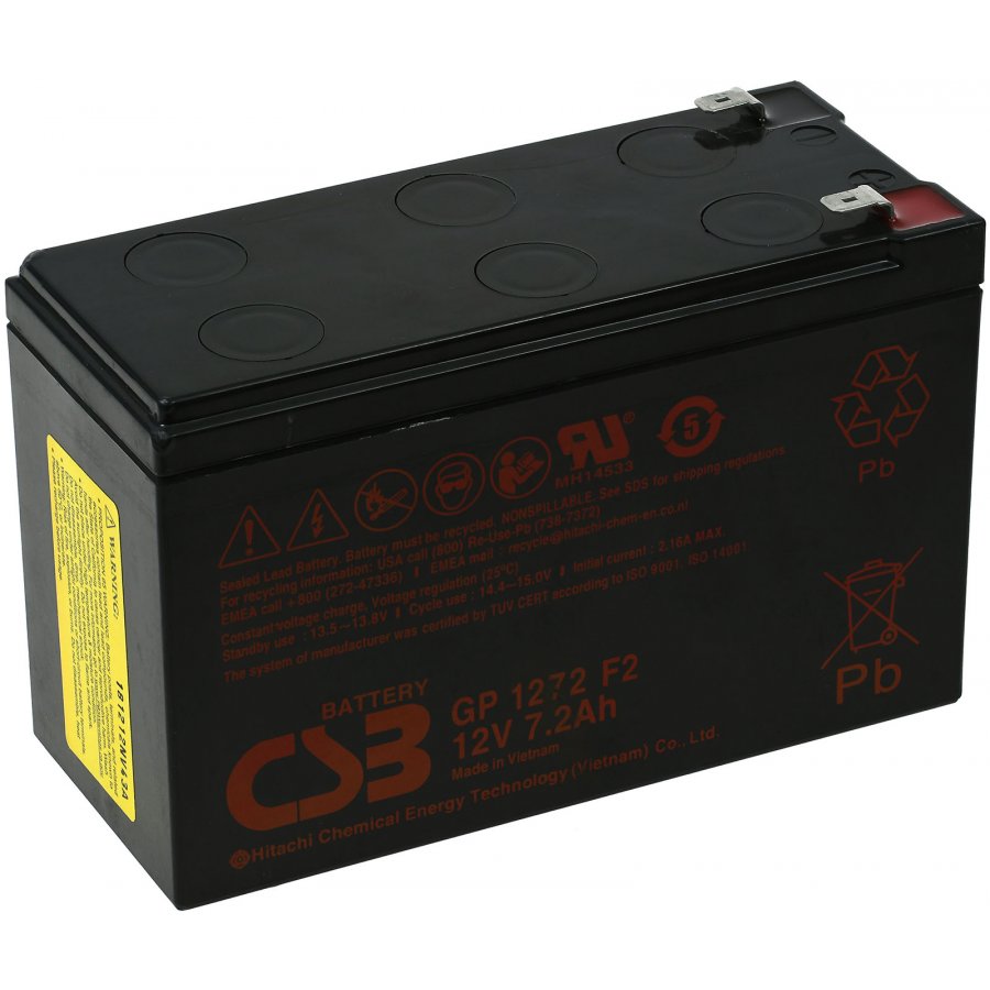 12V7,2AhLead-AcidSvart151mm x 94mm x 65mmCSB4062438132322Underhållsfria märkesbatterier av hög kvalité till strömförsörjningen industrin, till nödströmssystem (UPS-system) samt i säkerhet och larmsystem.