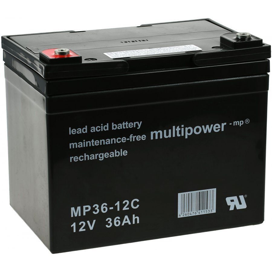 12V36Ah/432WhLead-AcidSvart197mm x 130mm x 159mmMultipower4062438101458högkvalitéts, underhållsfria märkesbatterier används för cykliska applikationer, t.ex.. I rullstol eller caddies.
